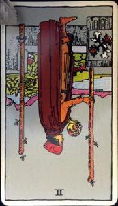 『ワンド2』は、二本の棒のうちの一本を選んでいることから「二者択一」の示唆として知られています。
