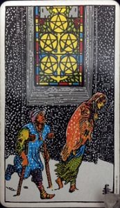 ペンタクルは金銭・労働・現実を象徴し、小アルカナの5は厳しさを象徴する数字ですのでウェイト版タロットに描かれているような意味は本来『ペンタクル5』には存在しません