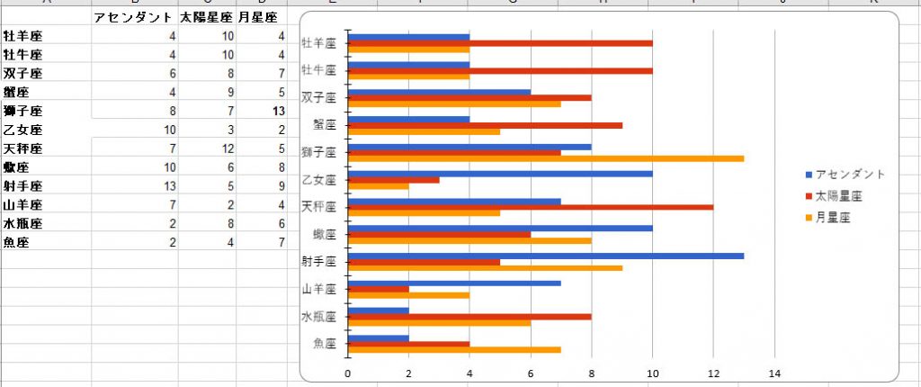 それぞれのアセンダントごとに何人いるのか、どんな人がいるのか、太陽・月のサインは何かをチェックしました。
