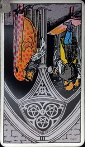 『ペンタクル3』が逆位置で出るときは協力関係・信頼関係にチグハグ感が出ると言いますか「なんか上手く噛み合ってない」感が出やすいですので、いつもより丁寧なコミュニケーションを心がける・感情的にならない・思ったような成果が上げられなくても腐らない・・・などが必要といえそうです。
