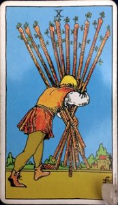 10本の棒を重そうに抱え、運んでいる人物が描かれている『ワンド10』は、しばしば「プレッシャー・重圧」の示唆として読み解かれます。