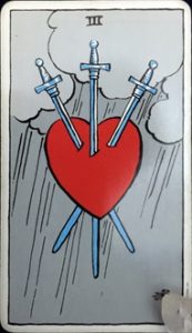 しかしながら、「剣の3」は「悲嘆」と呼ばれる、「タロット」における象徴は3本の剣が突き刺さった心臓である。